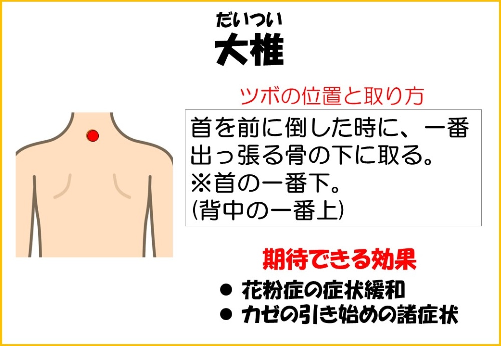 首の後ろ、首を前に倒したときに出る大きな骨(第7頸椎)の下にあるくぼみ。体の熱をさまし、のぼせや首肩のこわばりをやわらげる働きがあります。 - 曲池(きょくち)